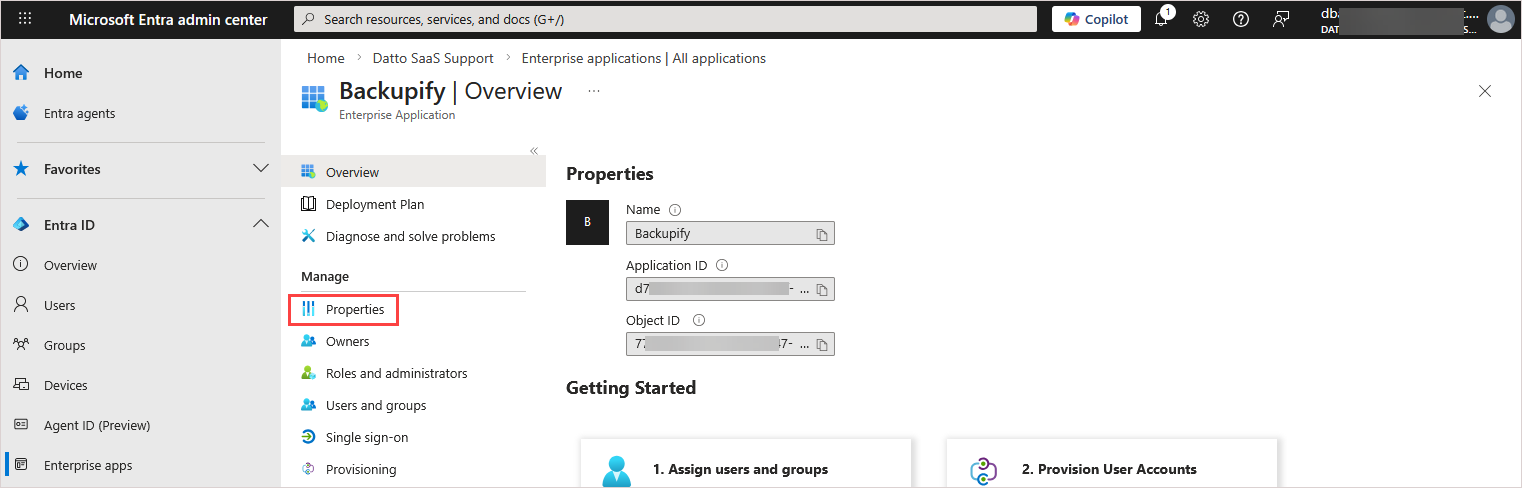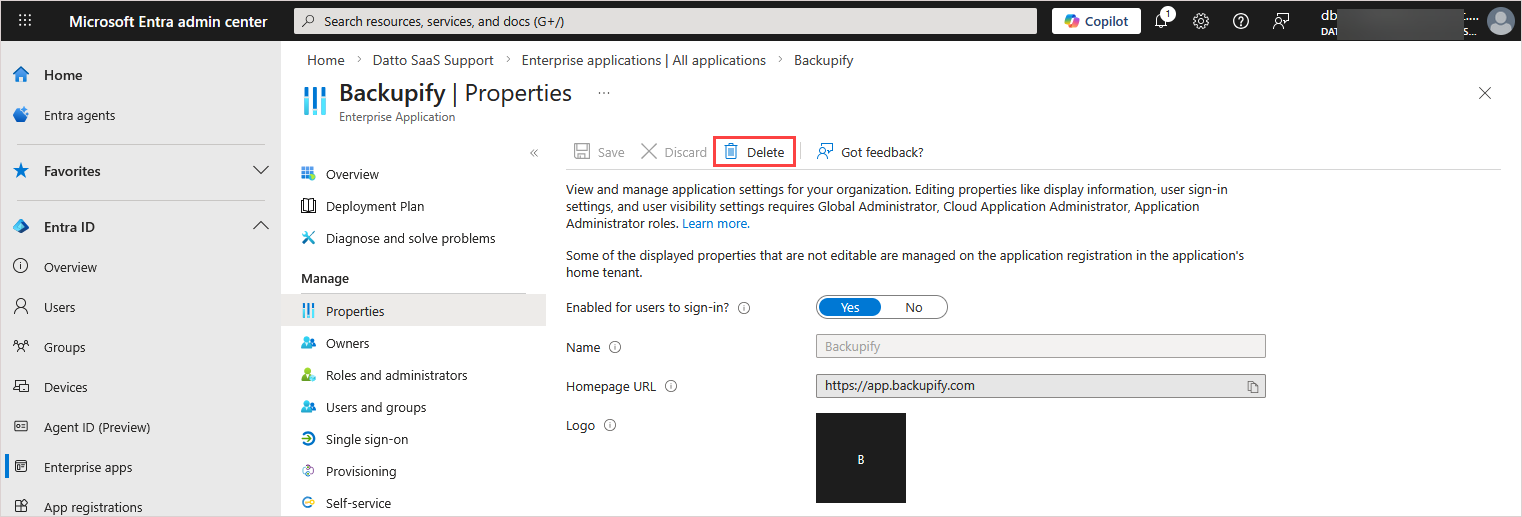 In the Microsoft Entra admin center, click Enterprise apps and select the SaaS Protection Backupify application.
