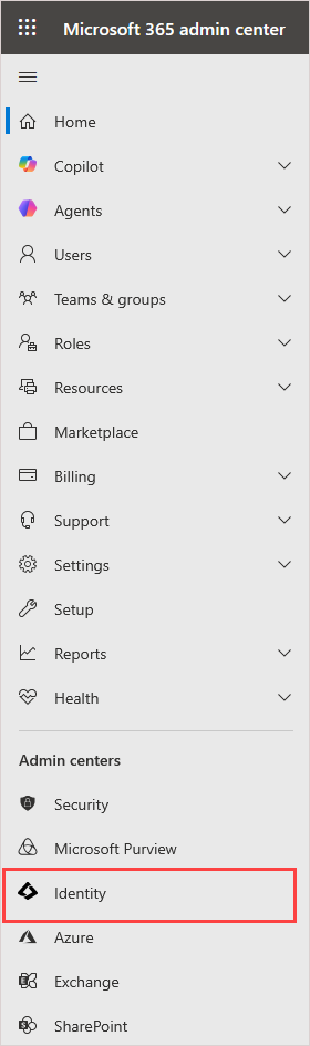 Log into the Microsoft 365 admin center, then click Identity under Admin Centers in the left navigation menu.