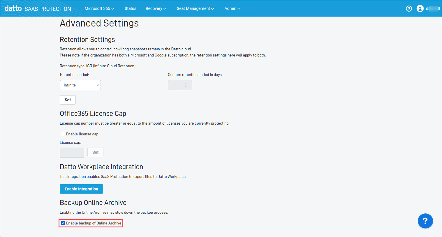 - This feature is supported on SaaS Protection v3.0 only. If you do not see Backup Online Archive on the Settings page, the feature is not supported in your environment. (See How can I tell which version of Datto SaaS Protection my organization is using?)