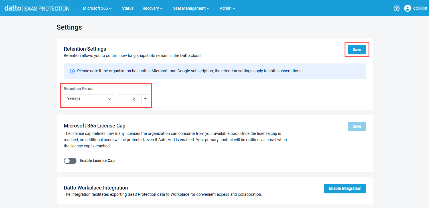 - If an organization has SaaS Protection accounts for both M365 and Google Workspace, the retention and license cap settings apply to both.