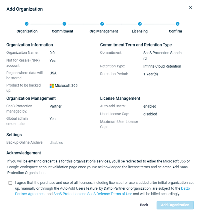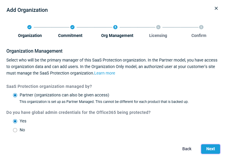 - In SaaS Protection organization managed by?, Partner is selected (as NFR accounts must be partner managed).